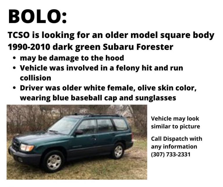 The Teton County Sheriff’s Department is looking for an older 1990 to 2010 model dark green Subaru Forester that was involved in a felony hit and run collision. The car may have damage to the hood. The driver was an…